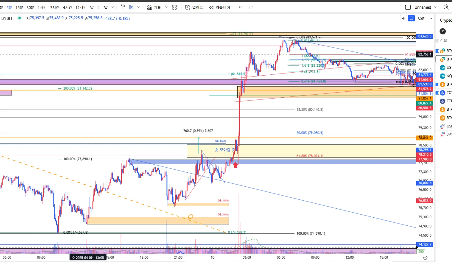 원웨이로 계속 상방으로 밀어올리는 것을 볼 수 있었고, 이를 관찰함과 동시에, 확장 피보 기준으로 1~1.2 (길게는 1.618까지) 천천히 모아가고자 했습니다.