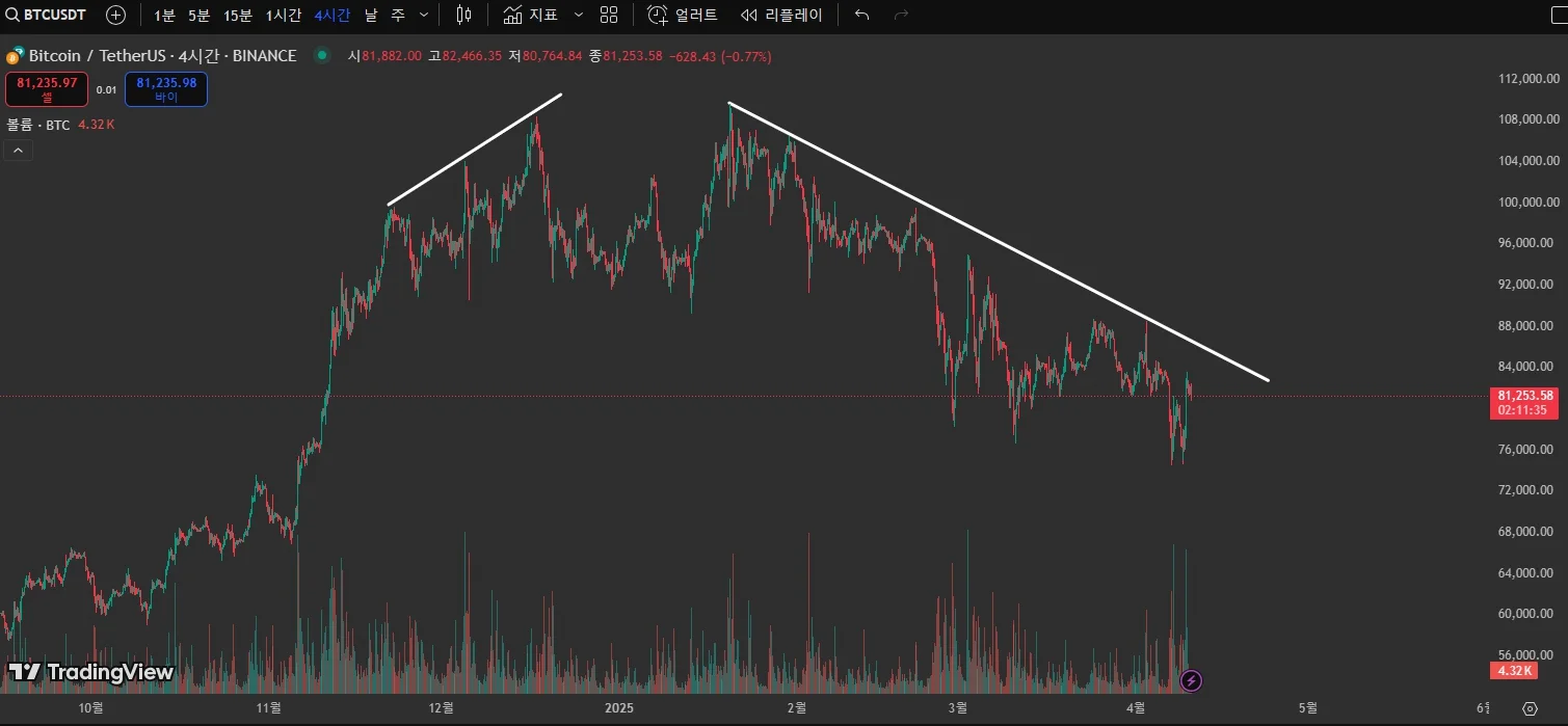 네, 지금 올려주신 4시간 봉 차트를 보면 전형적인 하락 추세 구조로 보입니다. 고점과 고점이 점점 낮아지고 있고, 그 흐름을 연결한 추세선도 잘 작도하셨습니다. 이럴 경우 기본 전제는 추세는 지속된다는 가정 아래, 하락 흐름이 이어질 가능성이 높다고 판단합니다.챌린지 완료까지 응원하겠습니다❤️