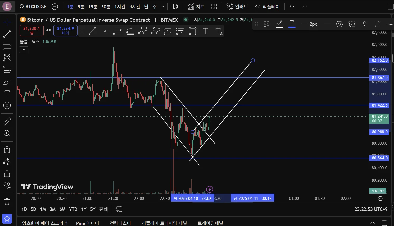 1분봉 기준으로 분석해보았고 하락하다가 반등할 것 같은 추세입니다. 추세선, 저항선을 그어보긴 했는데 아직 익숙하지 않은지라 올바로 했는지는 잘 모르겠네요 ㅎㅎ