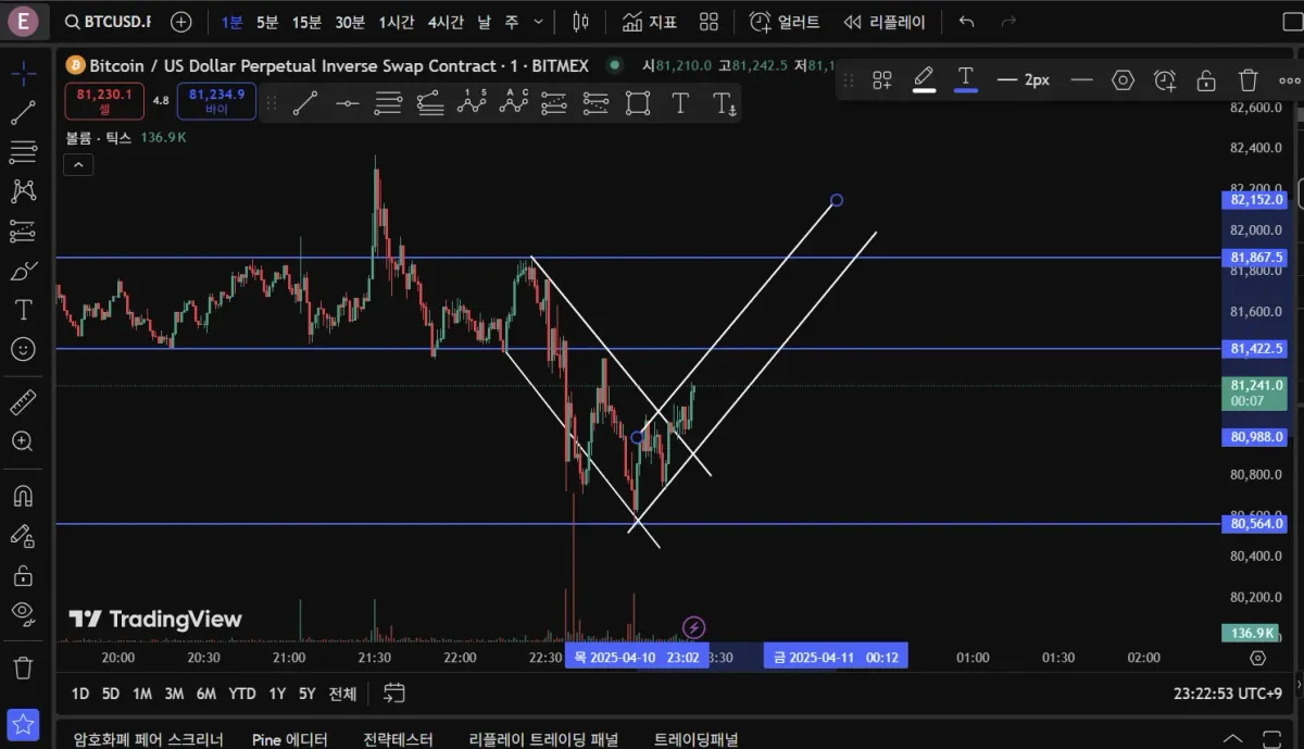 1분봉 기준으로 분석해보았고 하락하다가 반등할 것 같은 추세입니다. 추세선, 저항선을 그어보긴 했는데 아직 익숙하지 않은지라 올바로 했는지는 잘 모르겠네요 ㅎㅎ