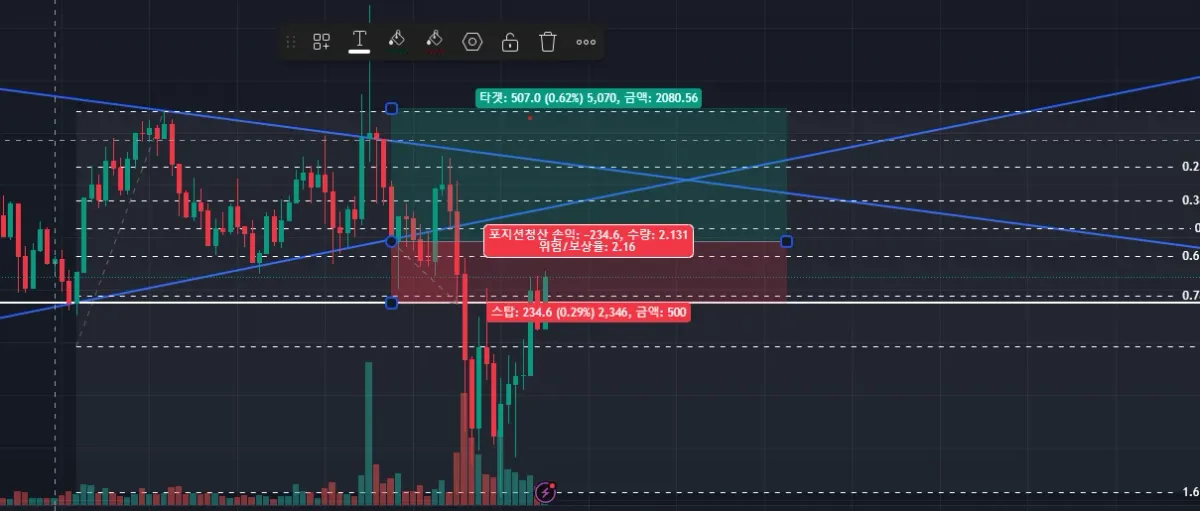 수렴중 상방 이탈 꼬리 형성후 다시 자리를 찾아 오면서 상승을 위한 자리를 잡는것으로 판단 수렴구간 아래에서 롱 진입 하지만 하방 이탈 나와주면서 손절가에 도달하여 손절