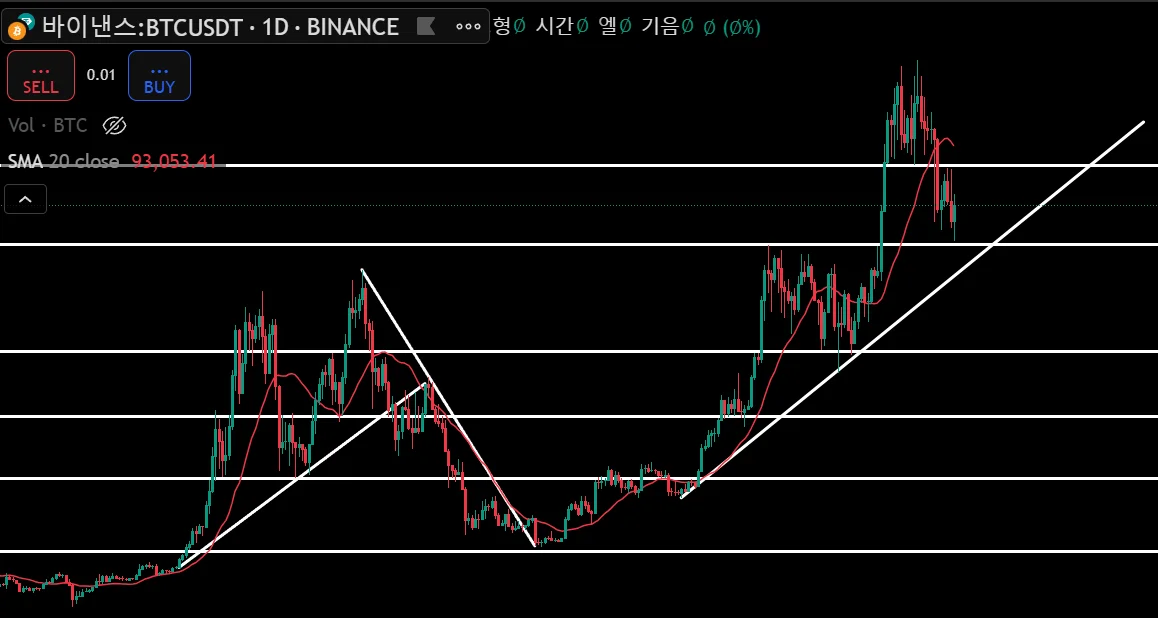 상승 추세는 아직 유지하고 있지만 추세선 지지 여부가 중요해 보입니다.
