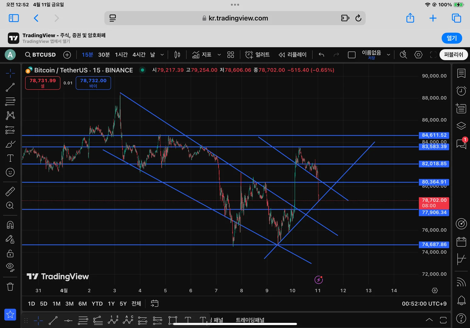 비트코인 15분봉으로 지지선과 추세선을 그어보았고 반등이 나올만한 자리로 보입니다