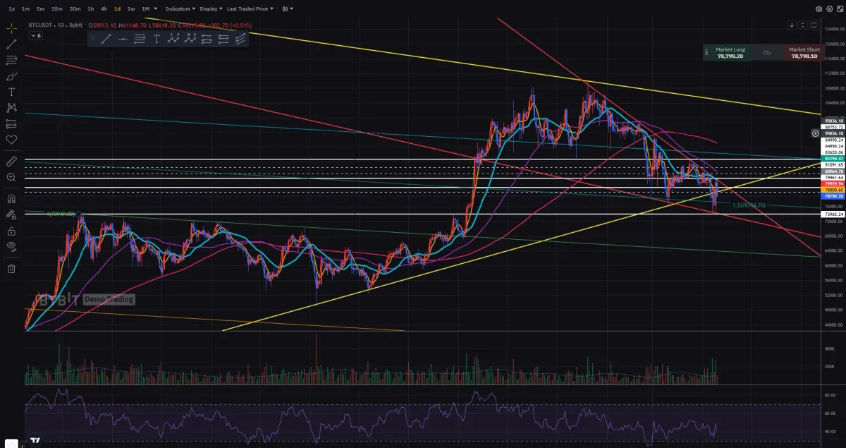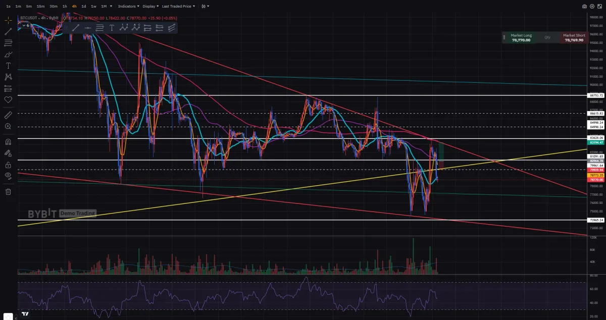 진입 시점이 4시간봉 상 지지 저항 라인으로 판단했고, 하락한다면 4시간봉 기준 더블바텀 형성으로 넥 부분과 노란 추세선이 만나는 부분에서 리테스트 이후 폴링웻지 상단까지 상승할 것이라 판단하여 진입