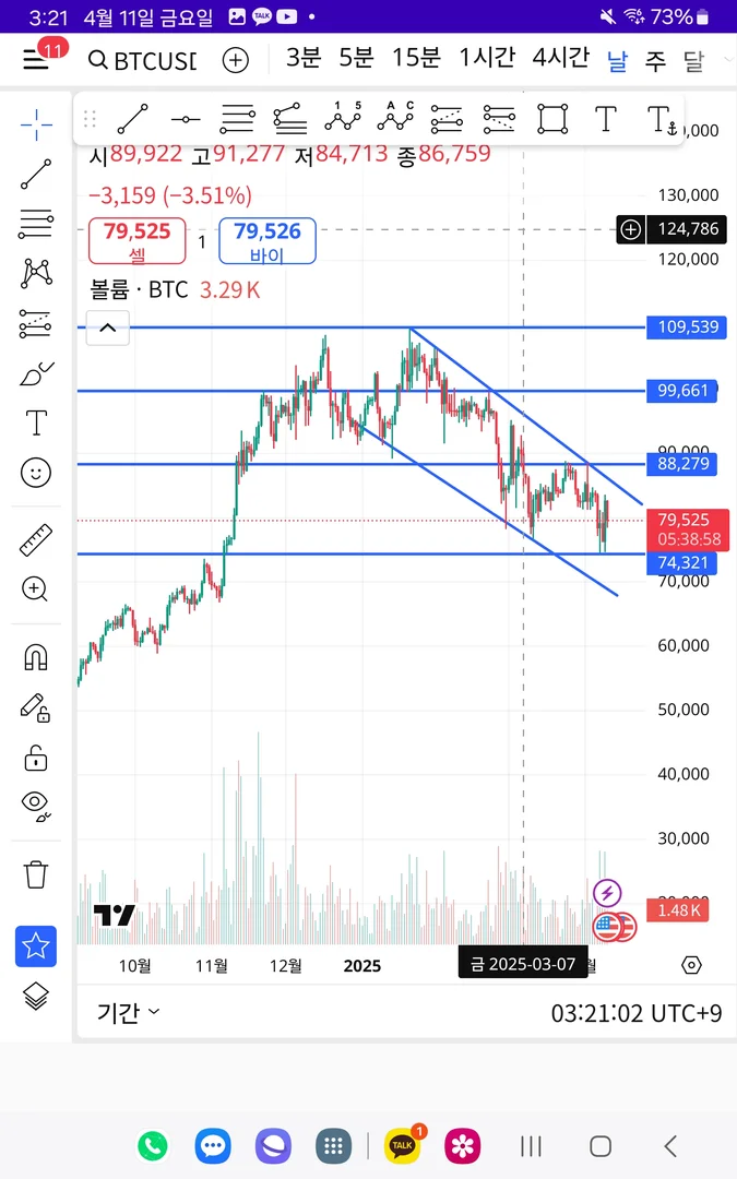 추세는 하락이나 트럼프가 90일 관세 유예를 햇으니 다시 한번 88k저항을 돌파하면 99k를 도전해 볼수도 있지 않을까요