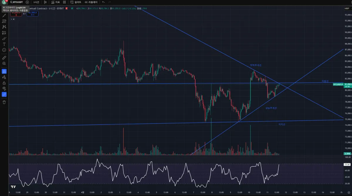 현재 상승추세선을 터치 후 저항선을 맞고 떨어진 자리인데 돌파를 하지 못할 시 하락이 나올 거 같습니다