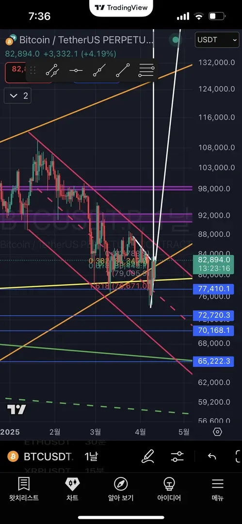 중간에 보이는 노란선은 전 고점과 이어지는 라인이라, 확실히 저 라인을 기점으로 저점을 높히며 하락채널을 돌파해야 한다고 느낌