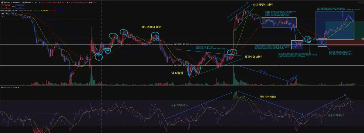 2주차에서 배운 패턴과 함께 이동평균선과 RSI지표를 활용하여 나타내보았고, 또 만약 내가 매매를 했을 때 어떻게 상황을 진행할지 한번 적어보았습니다.