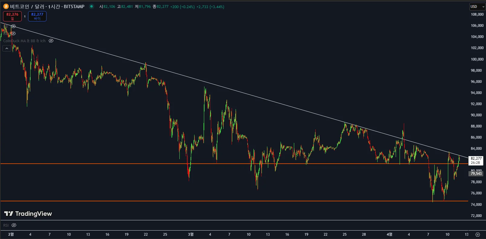 1시간봉상 하락트렌드 밑에서 계속 저항을 받다가 다시 테스트하러 올라온 그림.