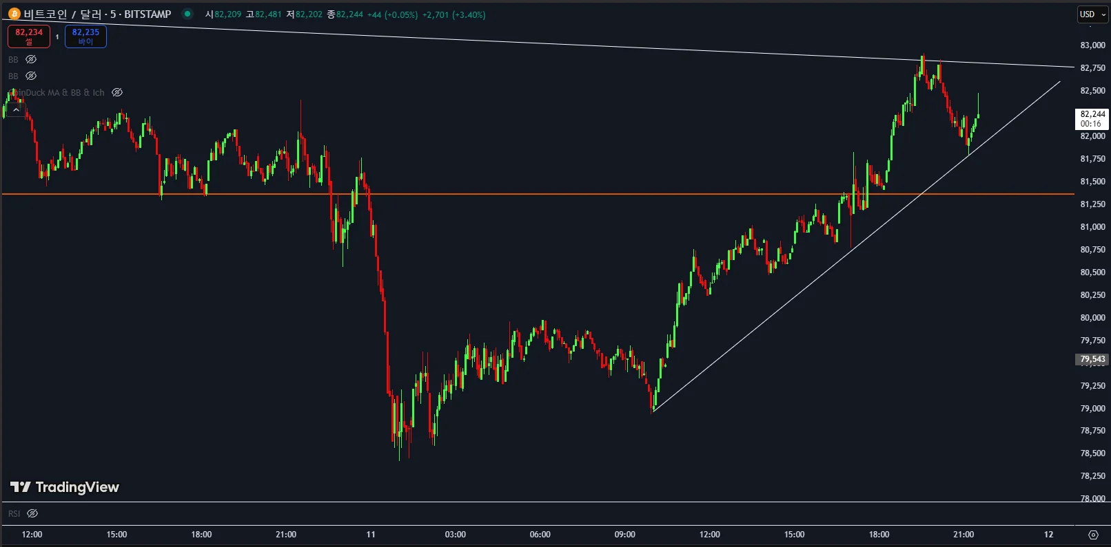 5분봉상 가파른 상승수체를 타고 1시간봉 기준 하락추세선에 맞닿고 확인하는 모습.