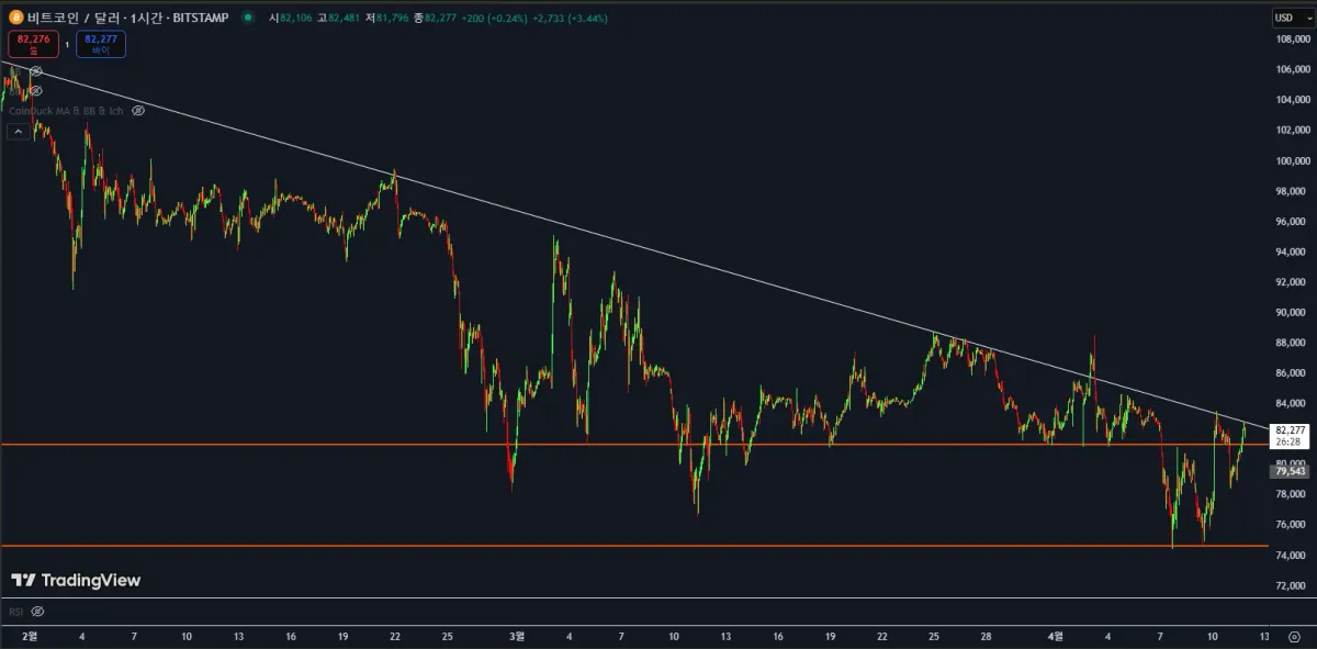 5분봉상 가파른 상승수체를 타고 1시간봉 기준 하락추세선에 맞닿고 확인하는 모습.