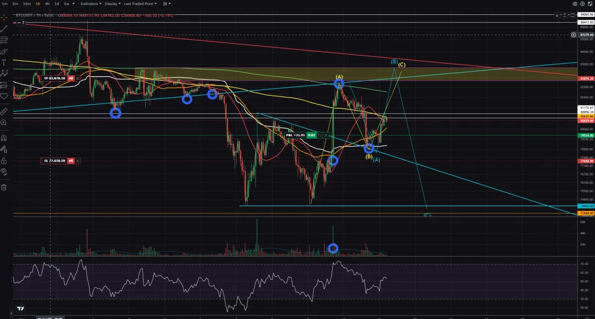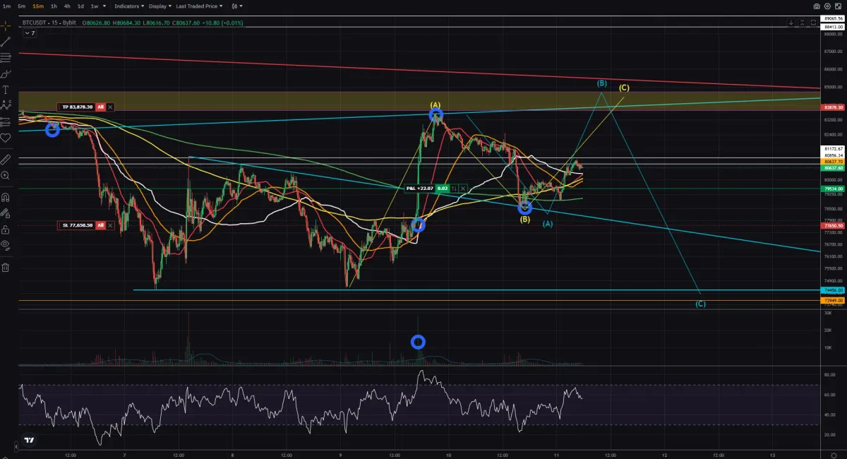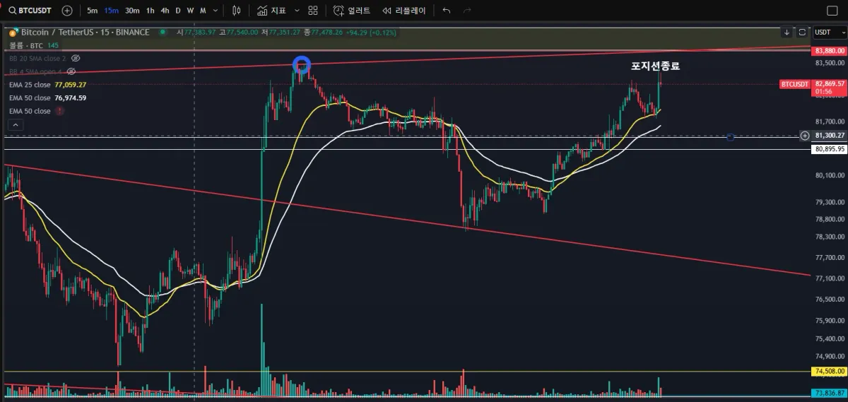 15분봉이며 ABC파동을 반대로보아도 올리는 한파동이 남아있다고 생각하고 상단 하늘색선은 유의미한 지지선으로 익절구간을 걸어둔상태였으며