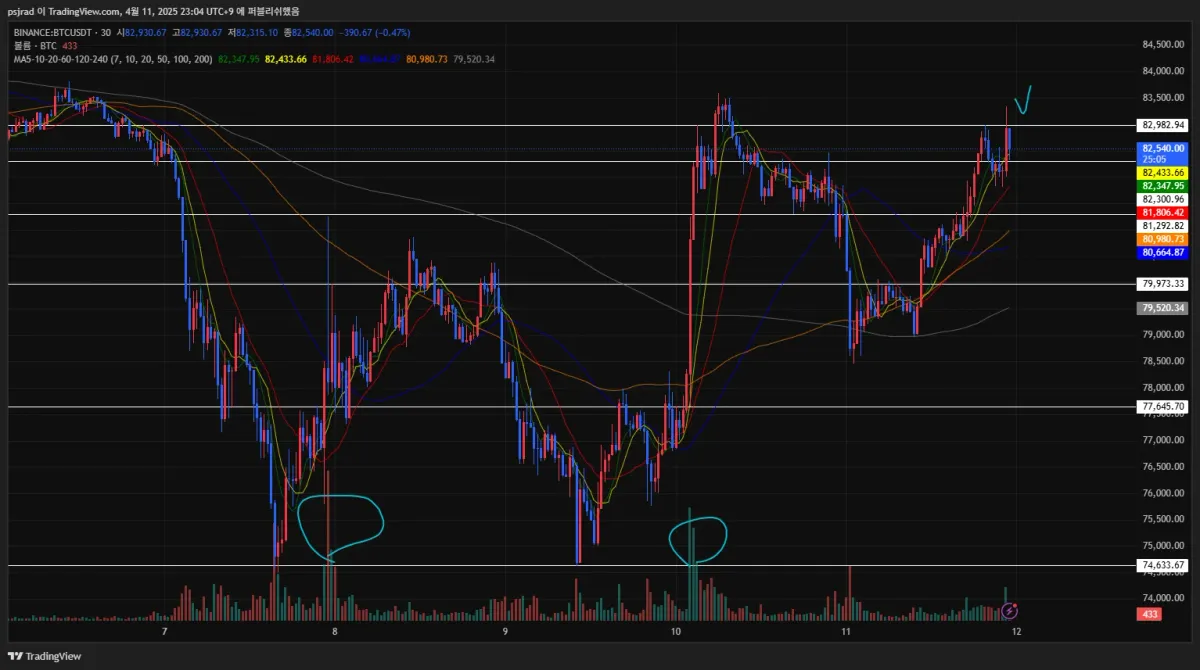 거래량이 크게 나온 저점에서 가로선을 긋고 그 위로 가격이 올라간 상태에서, 다시 그 구간 위에서 반응을 보였다면, 해당 구간은 저항이 아니라 지지로 작용하고 있는 겁니다. 즉, 말씀하신 것처럼 동그라미 쳐진 저점들에서 거래량이 많이 나오면서 반등이 시작되었고, 그 위치에 가로선을 그었다면 해당 가격은 지지선이 되는 겁니다. 지지란 말 그대로 가격이 하락하다가 멈추고 다시 올라가는 구간이니까요. 그 위에 표시한 부분은, 과거에 지지받았던 가격을 돌파한 이후, 다시 내려오지 않고 위에서 눌림이 나왔다면 그 가격은 지지선이 유지된다고 볼 수 있습니다. 지지선이 유지되면 추세는 살아 있는 거고요. 저항은 보통 상승 중에 여러 번 가격이 부딪혀서 못 뚫었던 구간이거나, 과거에 거래량이 터졌던 고점 라인에서 형성됩니다.