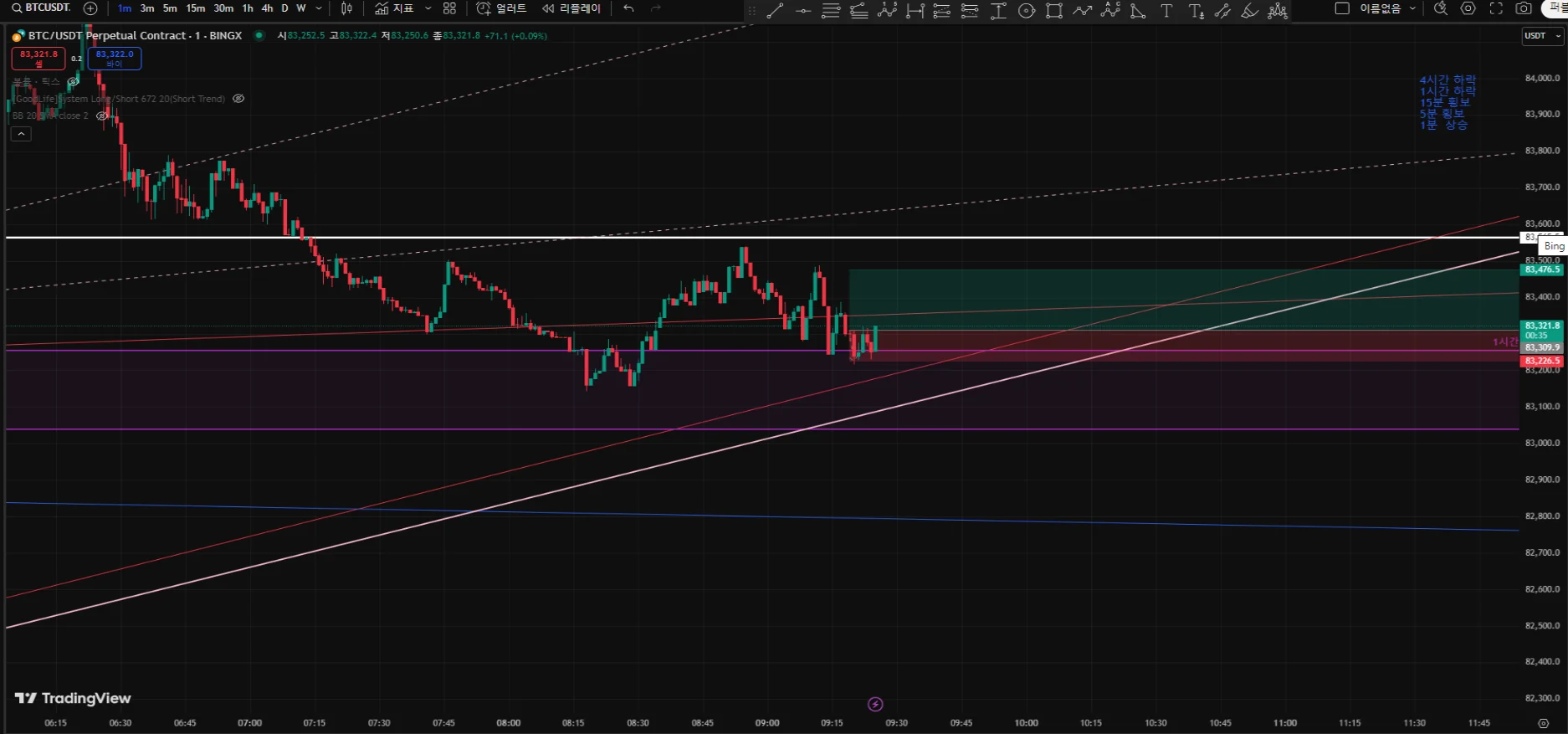 1시간 OB구간 및 분봉 패러렐 상승 중에 하단부근에 있음.