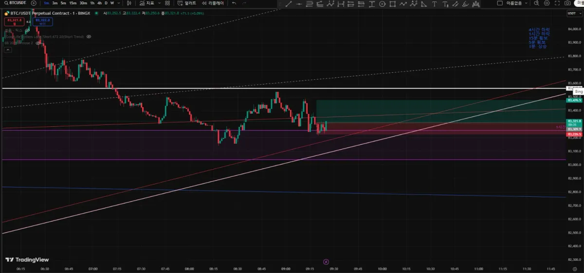 1시간 OB구간 및 분봉 패러렐 상승 중에 하단부근에 있음.