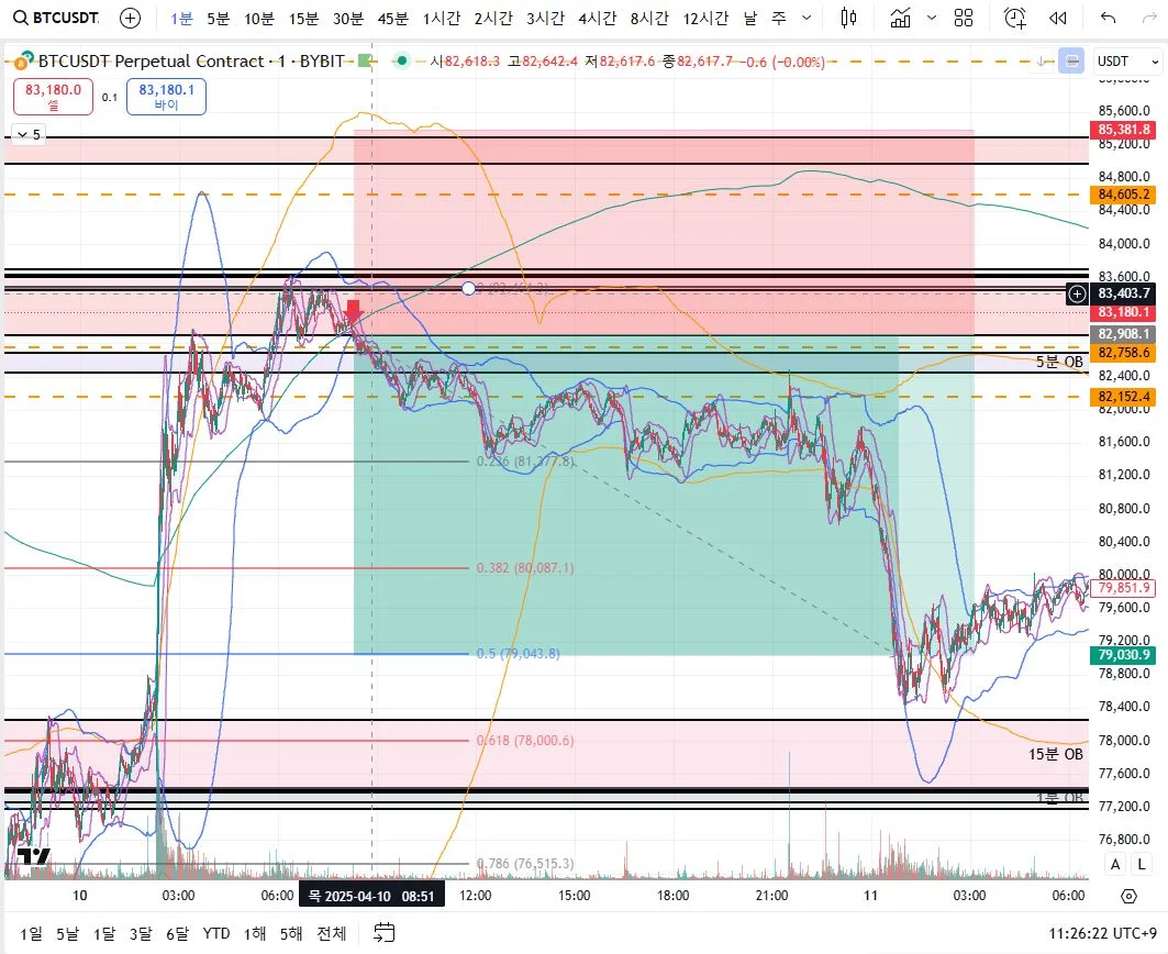 분봉 홀더밴드 과매도구간, 15분봉 OB의 저항받고 내려옴으로 인하여 상승의 되돌림 0.5 및 손익비 1.57 정도로 숏 진입