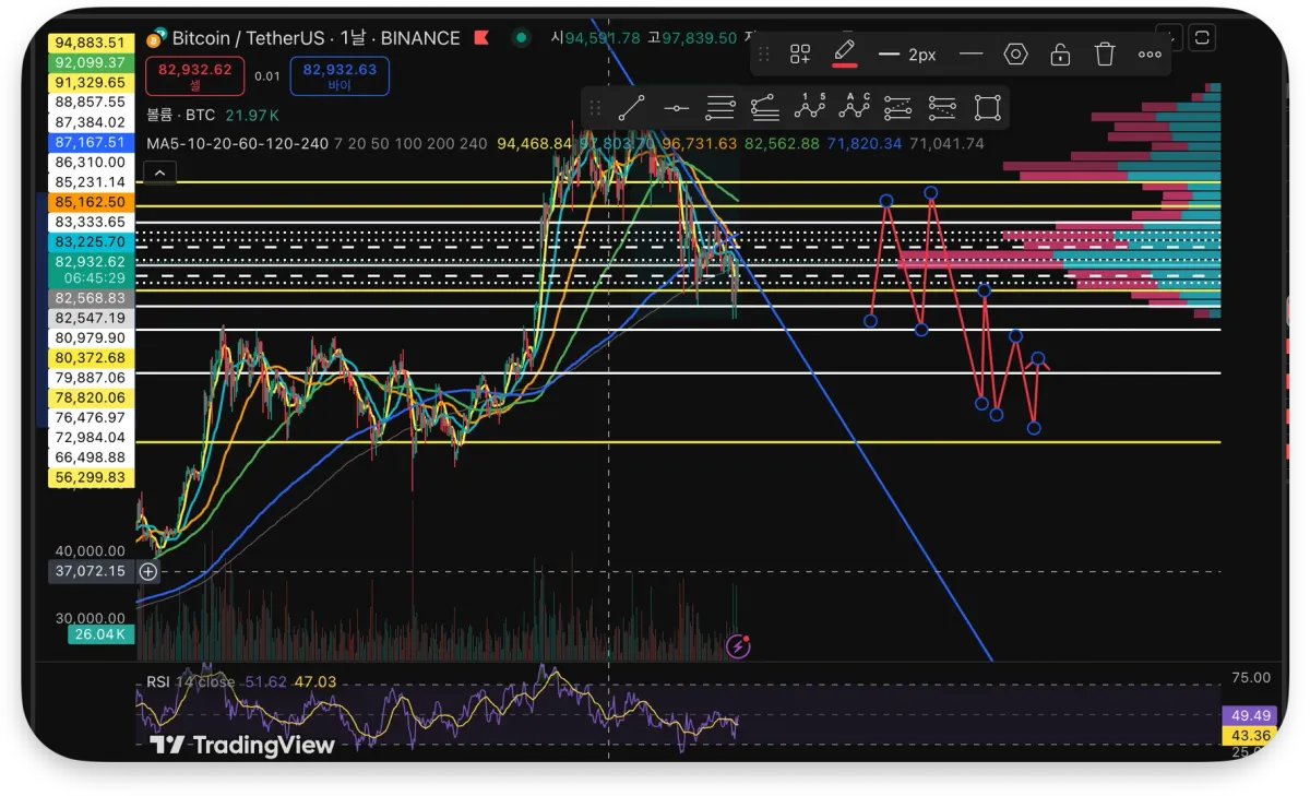 지지와 저항 추세를 고려해보았을 때 저점과 고점을 계속 낮춰가는 것으로 보아 전환된 하락 추세를 계속 이어 갈 것으로 예상 추세저항선을 붙일때 반등이 나오지 않을시 숏포지션을 들어가기로 계획했습니다.