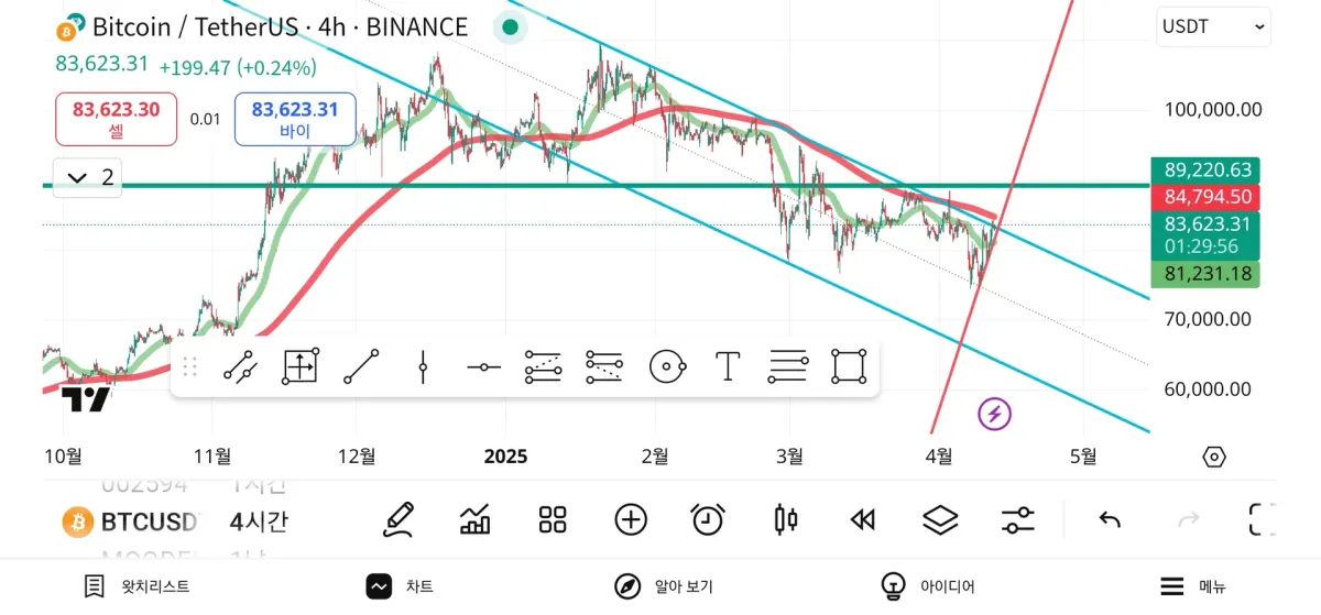 현재는 장기하락채널을 계속해서 뚫으려고하는 움직임이고 캔들이 채널상단에 올라탄다면 롱에 한번더 배팅예정입니다.