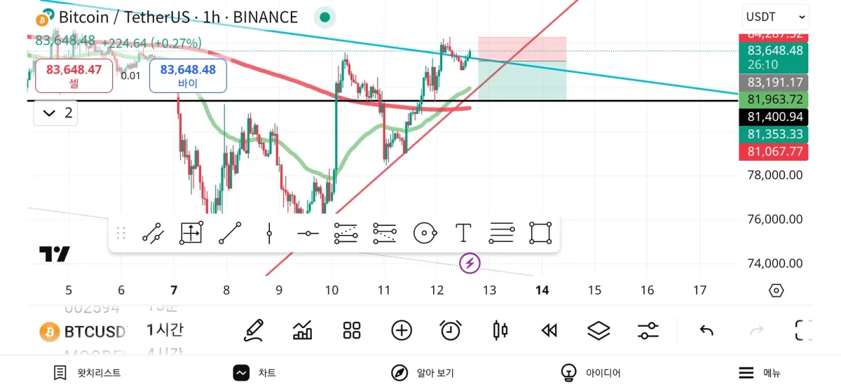 매도세가 계속 이루어질경우 fake out이 발생했고 최소 전저점까진 내릴거라고 판단하여 1:1.6 정도의 비율로 매매진입(83200 숏). 흐름을 지켜보니 매도세도 생각했던것 보다 약한것 같아 약익절하고 빠져나왔습니다.