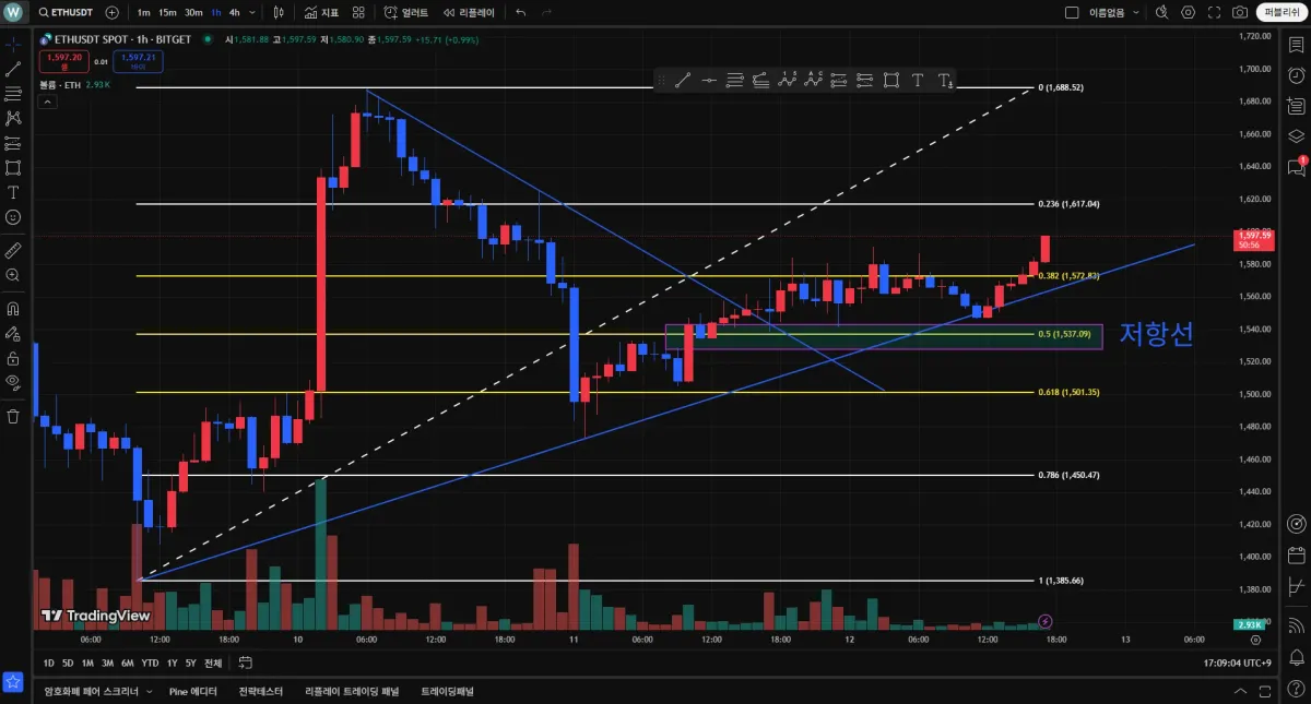 비트겟 이더리움 1일봉에 피보나치 수열을 작도하고 상승,하향 추세선을 작도하여 보았습니다.