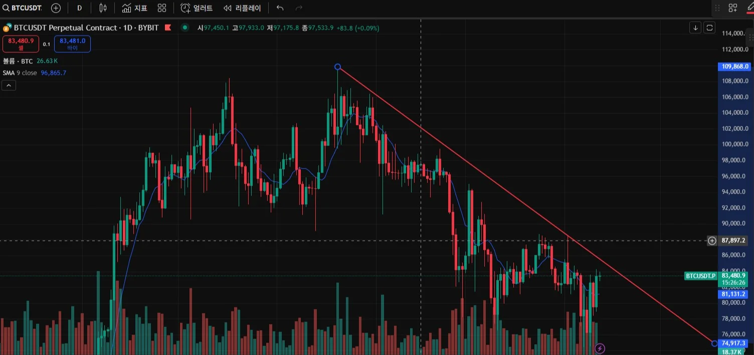 중장기적으로 시장의 흐름을 파악하고 싶어서 일봉기준으로 보았고, 일봉에서 그린 하락 추세선입니다. (맞게 그린건지 모르겠네요.)