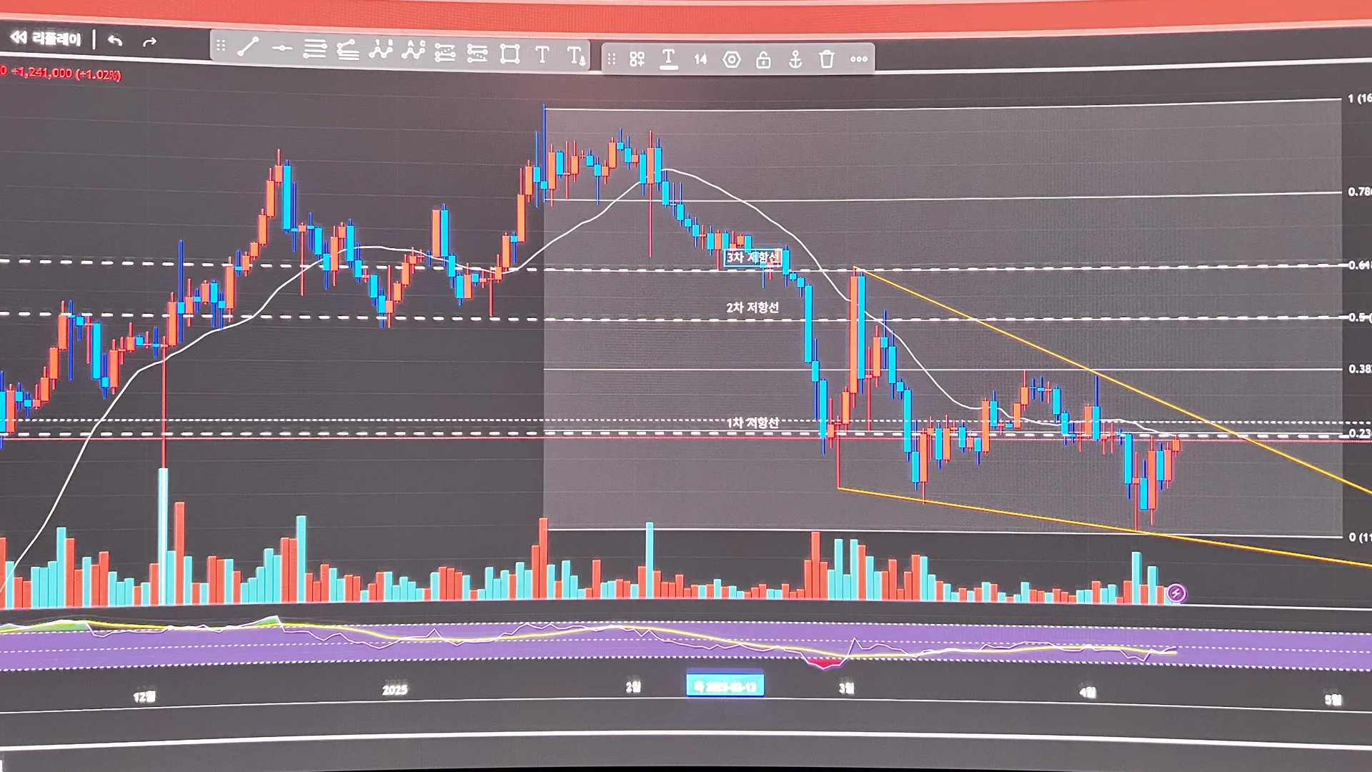 추세선과 지지저항선 피보나치의 되돌림을 적용해서 작도를 해보았습니다… 초보지만 열심히 하겠습니다