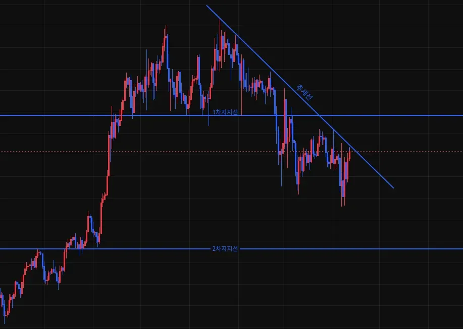 최근 뚫린 저항지점을 1차, 큰 상승폭이 있던 구간을 2차 지지선으로 잡았습니다.