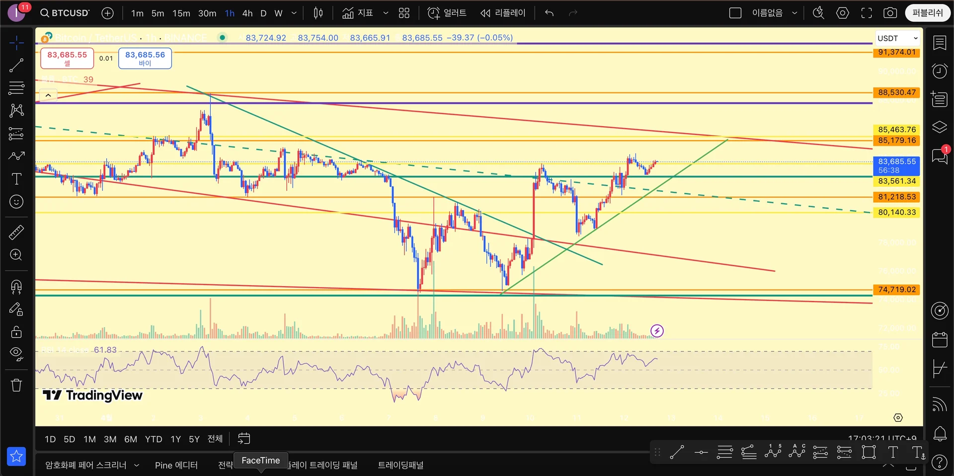 하지만 너무 성급히 들어간 나머지 빨간색 추세선에 도달아기 전인 83477달러에 숏 포지션 진입을 했고