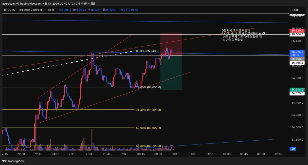 • 1시간 추세선 1차 저항 후 하락 및 2차 시도에 기존 저항점 85,167 과 겹쳐서 진입