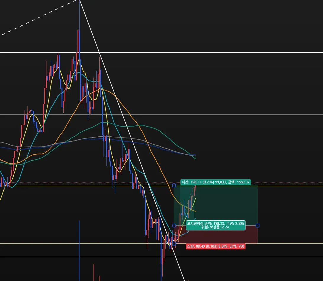 피보나치 0.5 아래를 깬후 다시 올라와서 0.5 부근에서 상승추세 받는것보고 롱 진입