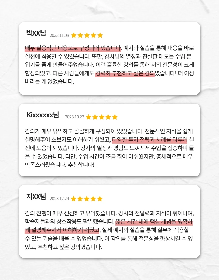 차트를 감으로 보던 시절을 반성하게 만든 강의였습니다. 기본 이론부터 실제 10년차 투자자의 시야까지 흐름이 자연스럽고, 복잡한 지표보다 왜 실패하는지를 명확히 짚어줘서 실전에 바로 써먹을 수 있었어요. 기술적 분석의 본질을 다시 세우고 싶은 분들께 강력 추천합니다.