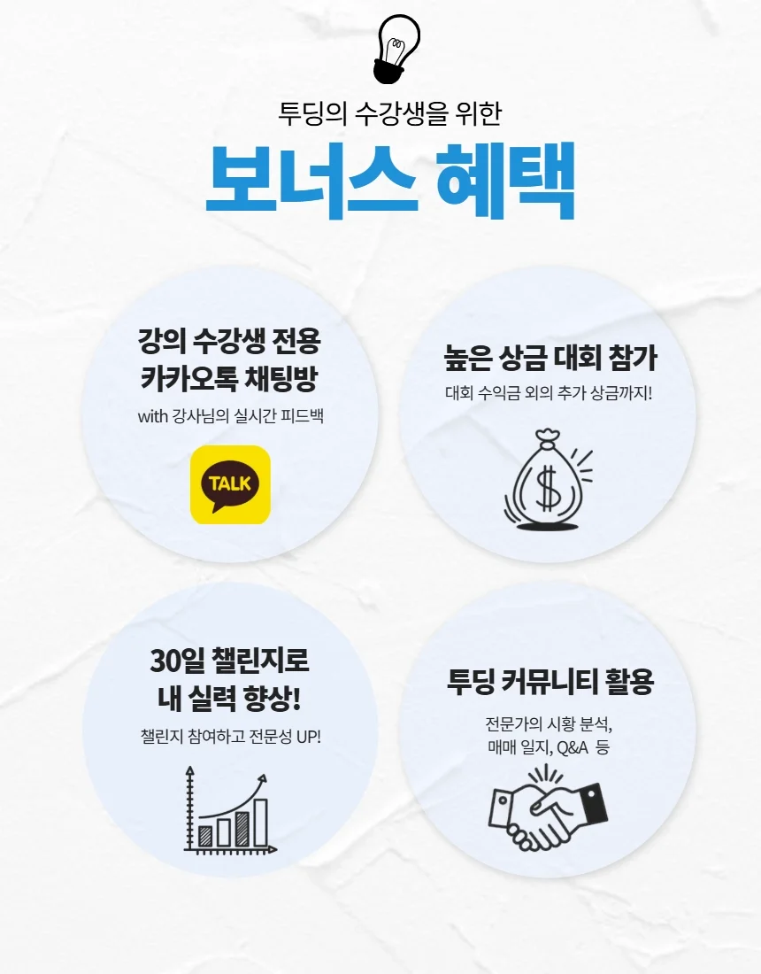기술적 분석 마무리 강의를 통해 그동안 배운 지표들을 실전에 어떻게 적용하는지 명확히 정리할 수 있었습니다. 챌린지를 진행하며 차트를 보는 올바른 관점을 갖게 되었고, 이제는 감에 의존하지 않고 객관적인 근거를 바탕으로 투자를 결정하는 변화된 제 모습을 발견했습니다. 앞으로도 원칙을 지키며 꾸준히 수익을 쌓아가는 현명한 투자자가 되겠습니다