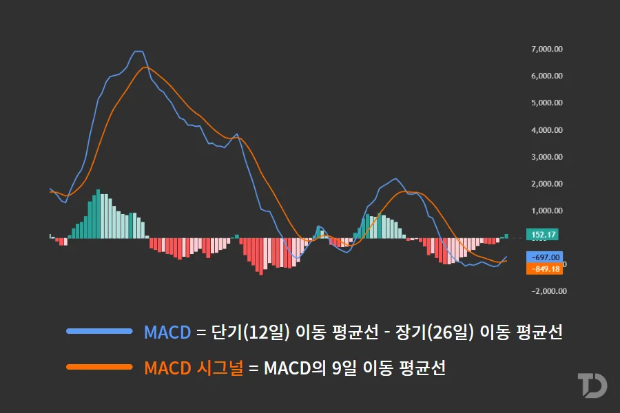 MACD = 12일 단기 이동평균선(EMA 12) - 26일 장기 이동평균선(EMA 26)